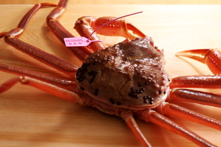 標準和名は、「紅ずわいがに」。松葉がにより深い、水深500~2,500mに生息しています。味は、松葉がにとは違った旨味・甘味があり、絹のような繊細な身質が特徴です。氷河期時代に日本海に南下した松葉がにが、氷河期終わりとともに流れ込んだ暖流「対馬海流」によって、深い海に移動したとされそのまま深海に。まさに1万年のロマンと言える蟹ですね。